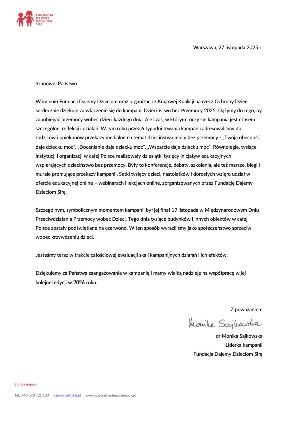 W imieniu Fundacji Dajemy Dzieciom oraz organizacji z Krajowej Koalicji na rzecz Ochrony Dzieci serdecznie dziękuję za włączenie się do kampanii Dzieciństwo bez Przemocy 2025. Dążymy do tego, by zapobiegać przemocy wobec dzieci każdego dnia. Ale czas, w którym toczy się kampania jest czasem szczególnej refleksji i działań. W tym roku przez 6 tygodni trwania kampanii adresowaliśmy do rodziców i opiekunów przekazy medialne na temat dzieciństwa mocy bez przemocy – „Twoja obecność daje dziecku moc”, „Docenianie daje dziecku moc”, „Wsparcie daje dziecku moc”. Równolegle, tysiące instytucji i organizacji w całej Polsce realizowały dziesiątki tysięcy inicjatyw edukacyjnych wspierających dzieciństwo bez przemocy. Były to konferencje, debaty, szkolenia, ale też marsze, biegi i murale promujące przekazy kampanii. Setki tysięcy dzieci, nastolatków i dorosłych wzięło udział w ofercie edukacyjnej online – webinarach i lekcjach online, zorganizowanych przez Fundację Dajemy Dzieciom Siłę.