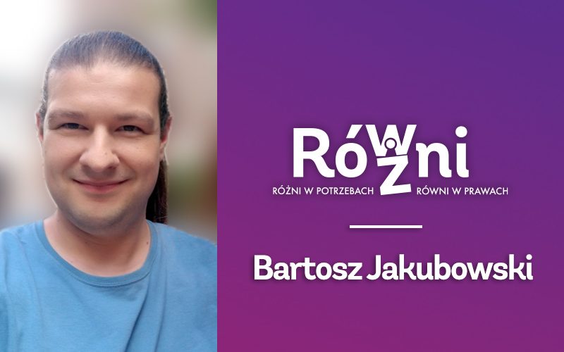 Bartosz Jakubowski – „Różni w potrzebach. Równi w prawach.” Witam wszystkich! Jestem Bartosz Jakubowski, mam obecnie trzydzieści sześć lat i pochodzę z Warszawy. Od drugiego roku życia posiadam diagnozę spektrum autyzmu, a gdy byłem nastolatkiem, okazało się, że mam też OCD, czyli potocznie nerwicę natręctw. Od ponad czterech lat jestem samorzecznikiem osób w spektrum autyzmu, z czego jestem naprawdę dumny, biorąc pod uwagę moje dotychczasowe dokonania na tym polu. Wystarczy wejść na mojego Facebooka lub Instagrama, aby się o tym przekonać.